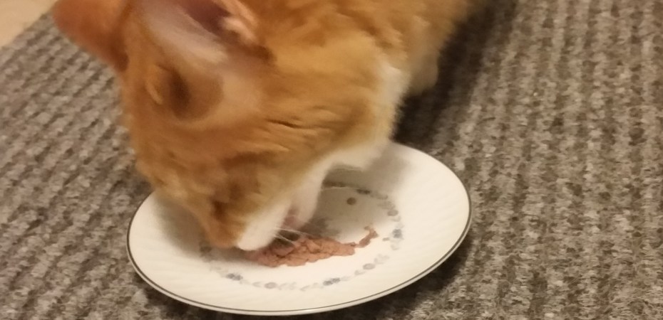Toby’s love of cat-food-eating started like this: Mom calls for the cats, “CAT DINNERS!” Teddy Cat and Tom Cat fly into the kitchen, legs moving quickly, tails high. Each of them get their own fancy little china plate with a tablespoon of wet cat food. It’s their daily treat! They LOVE IT. And it gives them something to eat while Minnie and I are eating our dinners. (Keeps them out of our way, too, because we girls EAT FAST and WITH GUSTO, and it’s impolite to get near our food while we’re eating.)